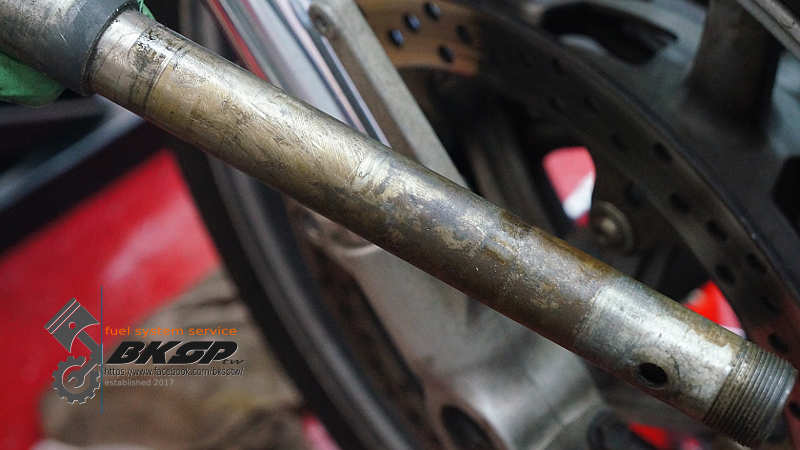| 左側的前叉內管有一道異常的磨損傷痕 |