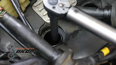 目前判斷可能是火星塞孔有滲油的問題, 這些自汽門蓋滲出的機油在更換火星塞時流入了燃燒室, 也因此才會發動後一直冒出刺鼻嗆人的白煙...